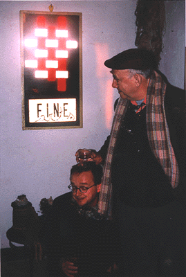 Daniel Spoerri (al collo, una sciarpa di Ghersi) davanti a "Fine Arts"