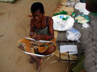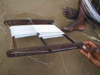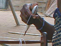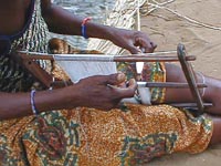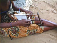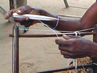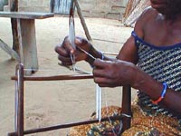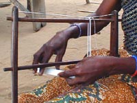 | Heddle Making NO (heddles) are built by NOVOTSI (heddle frame) and TSIBA (neddle). Heddlemaker Ayesuksede Adzatotor, Aklaga Kope (Klikor), Nov. 2001 |
