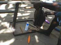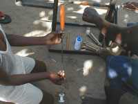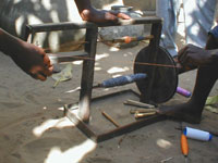 | Two Ply Yarn A special ETIEOMO (spinning mill) equipped with a reel spins KADADA (twisted yarn). KADADA warps are used to weave KADADAVOR. Weaver Doe Atimieku, Avloto (Klikor area), Nov. 2001 |