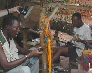 I AM A WEAVER I am a weaverListen, that shuttle: Tako tako tako tako, Through the warp Listen, that shuttle: The sound: Tako tako tako tako, Through the warp I am a weaver Listen, that shuttle: Tako tako tako tako, Through the warp I'll team up With the weaver bird That perches in my farm I am a weaver I'll distill the moist On the fern And lead the hopping hopper To his nest I am a weaver And going to team up With the weaver bird That carves in my farm You listen, That shuttle Tako tako tako tako, Through the warp I am a weaver Hear that Poem written in 1973 by Dale Massiasta "Tako tako tako tako" is the typical sound of the shuttle, that's also ritually shaken to spiritually stimulate weaving (YO WU). Photo: Alaska Azameti holding a ritual coconut cup, Atsu Azameti weaving. Klikor 2001. |