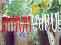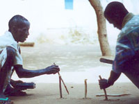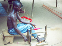 | Warping The thread is dried afters soaking in a kassava sarch solution. It is then spun in AYITI (warp spool) and ready for warping. William Azameti spinning by ETIEOMO, Unknown weavers planting NOTSIME pegs. Mensah Kpodoh controlling LOHO. Klikor; 2001. |