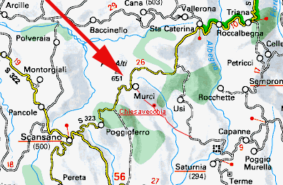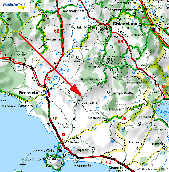 da Nord 1) ) Autostrada Milano-Genova-Pisa > Aurelia Livorno-Grosseto > uscita Grosseto Est > Scansano... 2) Autostrada Bologna-Firenze > uscita FI-Certosa > Superstada per Siena e Grosseto > uscita Roselle > Scansano > Murci > voltare a destra fino alla chiesa > seguire i segnali "Fantone". Dall'inizio strada bianca , 2° Campo a destra da Sud. Autostrada Roma-Civitavecchia > S.S. Aurelia> Montalto di Castro. > Vulci> Manciano> Montemerano> Pomonte> direzione Scansano > Dopo meno di 1 km., > Ragnaie. Seguire la strada fino alla fine> Murci > voltare a destra fino alla chiesa di Murci> segnali "Fantone"> inizio strada bianca> 2° Campo a destra Da Saturnia: Bivio per Usi > Strada nuova del Fiascone (per Murci) > Strada bianca a destra con segnale "Fantone" > 2° Campo a destra Dal Monte Amiata: Arcidosso o Santa Fiora > Bivio delle Bagnore > Roccalbegna > S.ta Caterina > Murci > voltare a destra fino alla chiesa di Murci > segnali "Fantone"> inizio strada bianca> 2° Campo a destra |