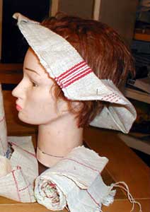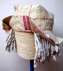 After the no-cut featuring of "Strag" and "Strat", the cloth is cut again in the "Daccapo" hat, but only following the weft thread that's quite unusual in hat featuring. Third item of the Afro<>loom Weaving Lab. Warp & weft: hemp see it also in Web-CID