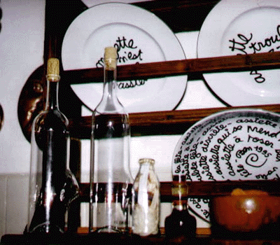 al centro: Succo di Tessuto di Ghersi (succo dell'arazzo in corridoio) attorno: bottiglie di Paterson (Ben) e piatti di Ben (Vautier) |