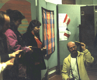 Al muro c'è appesa una speciale tela di Madras tessuta a mano. Estraggo da una scatola 81 tessere magnetiche, che ho ricavate da quella stessa stoffa, e le distribuisco tra il pubblico.