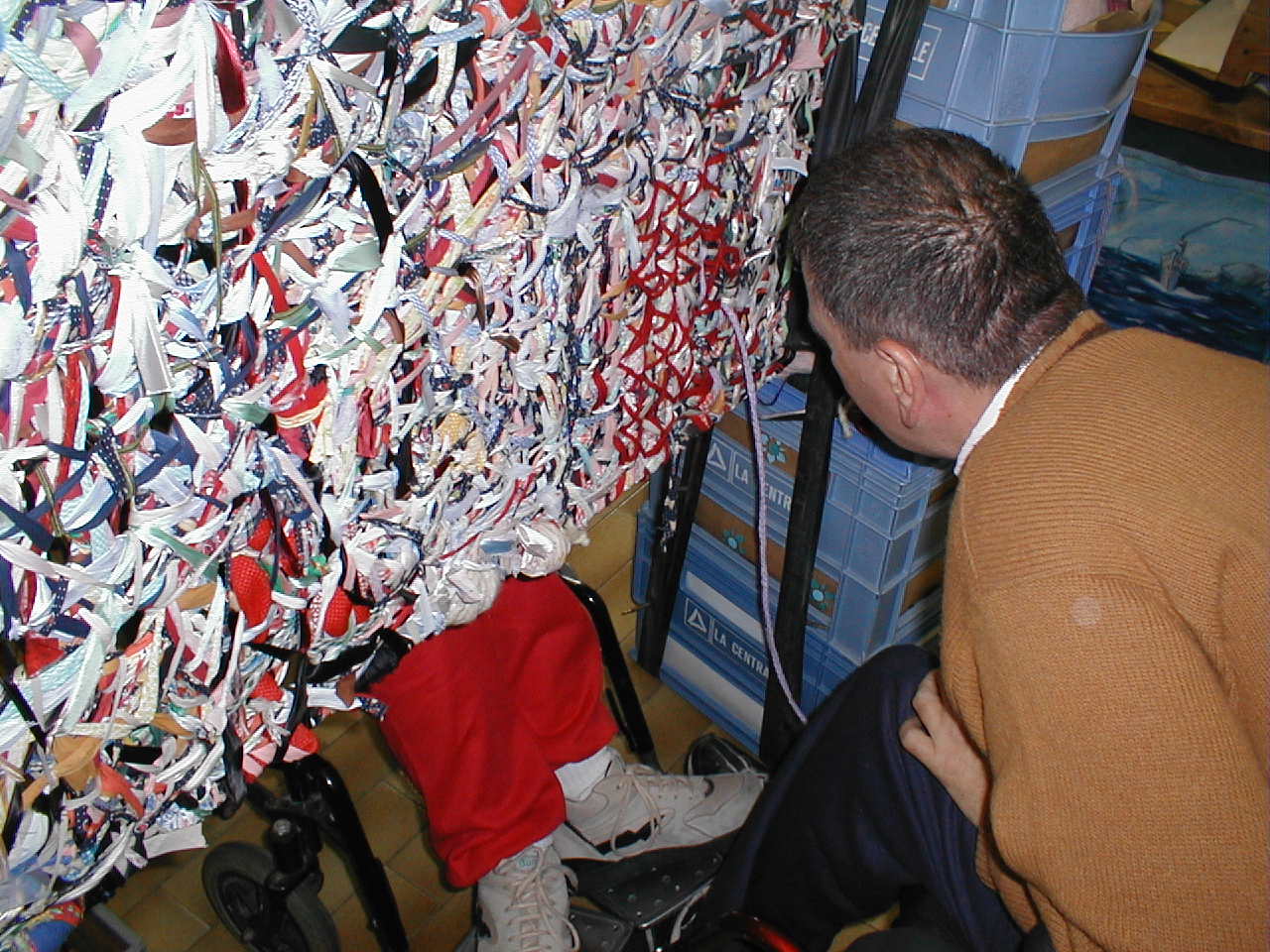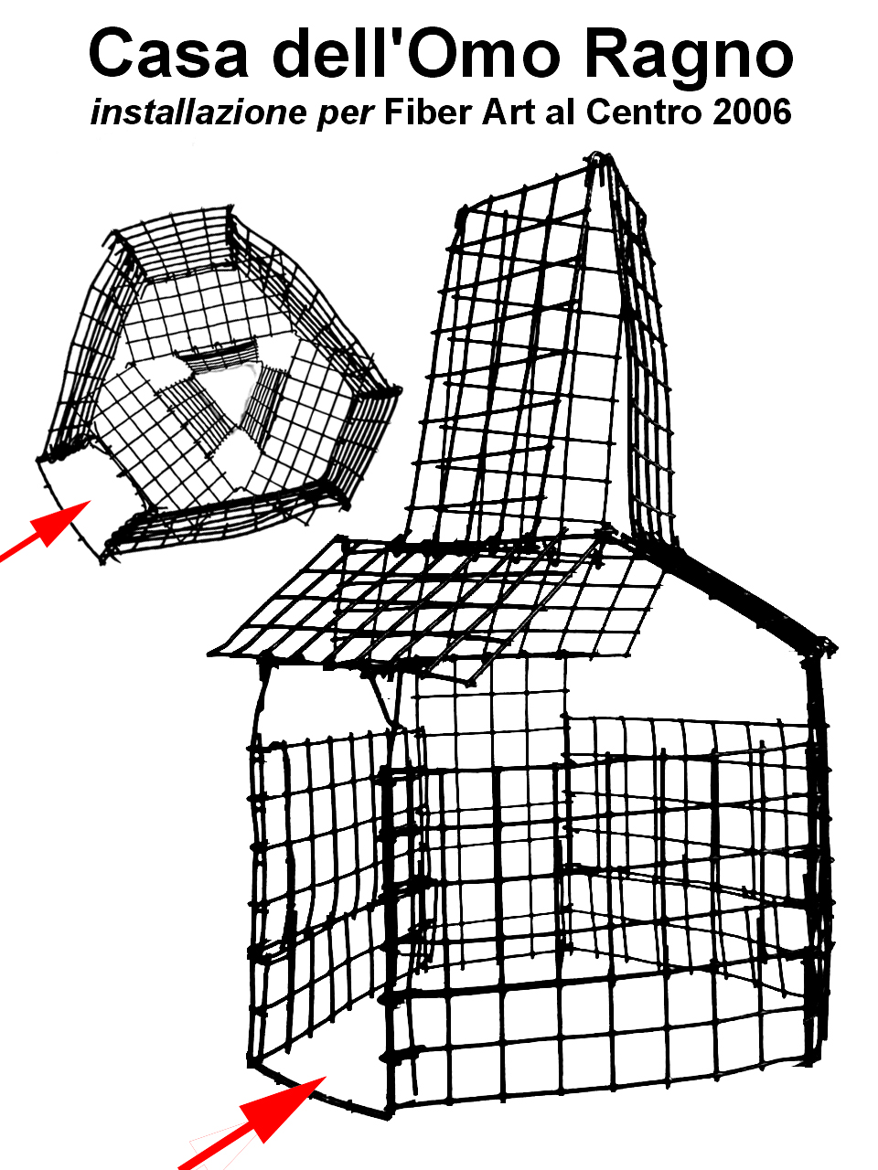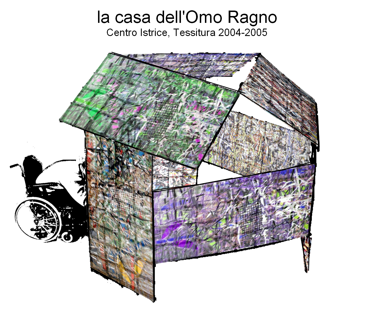 "La Casa dell'Omo Ragno" è un progetto realizzato contemporaneamente in due diversi Centri di riabilitazione e socializzazione occupazionale per Disabili vari, nei quali io mi trovo ad operare con il ruolo di "Tecnico di Tessitura" (8). Devo ammettere che il nome e l'obiettivo di tutto il progetto sono stati improvvisati in corso d'opera. Avevo da rispondere a domande più che ragionevoli dei miei Utenti, coinvolti al lavoro di uno strano e caotico intreccio che, certamente, non era la sciarpa, il cappello, la borsa o il tappeto, che sono i normali obiettivi dei nostri lavori di tessitura. Mi chiedevano; insomma: "Che cosa ci fai fare? Poi che cosa viene fuori?" Fu un'illuminazione, come suol dirsi: "Ma stiamo tessendo una casa per l'Omo Ragno!" In sé, tale obiettivo non apparve più assurdo dei consueti cartelloni e addobbi collettivi, cronicamente inflitti agli Utenti in previsione di primavera & pasqua, estate & vacanze, autunno & castagne, inverno & natale. In più, nel progetto, entrava in gioco il personaggio mitico-cinematografico dell'Omo Ragno: "Gli sarebbe piaciuta la casa? Cerchiamo di non scontentarlo!"