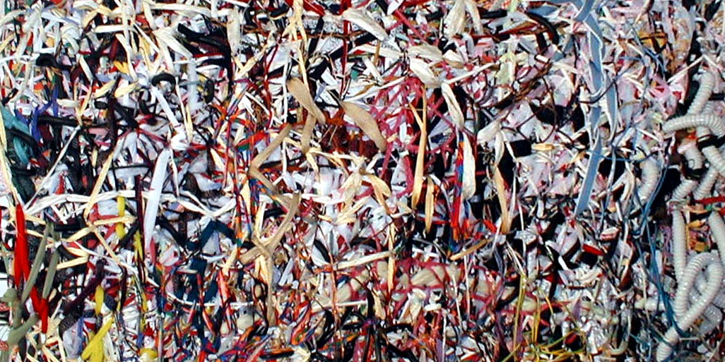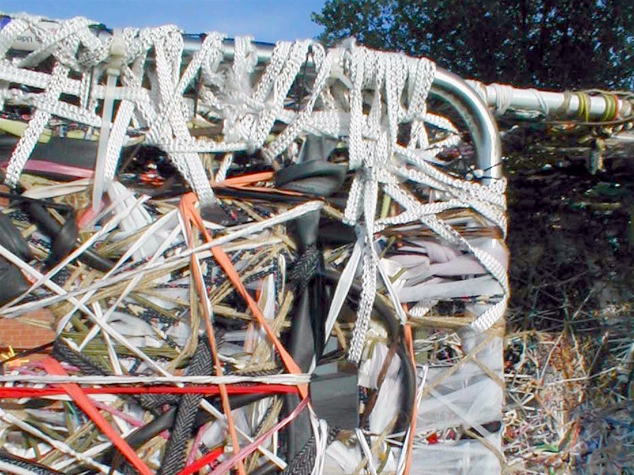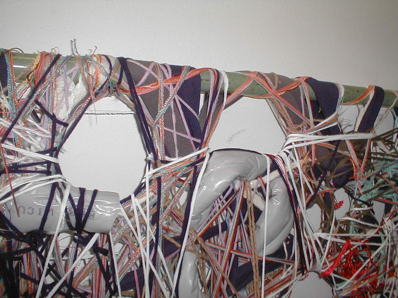 Dettaglio di pannello intessuto con stoffe lacerate, manicotti isolati per tubi idraulici, fili di vari colori roccati tutti insieme per ottenere maggiore resistenza, spago, fettucce in maglia, ecceteradetail1_09.JPG