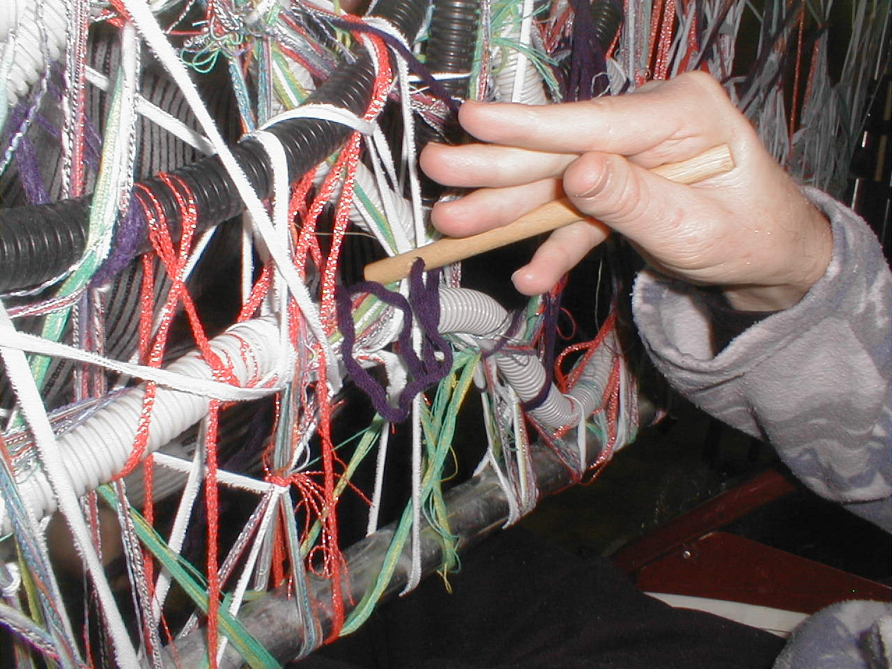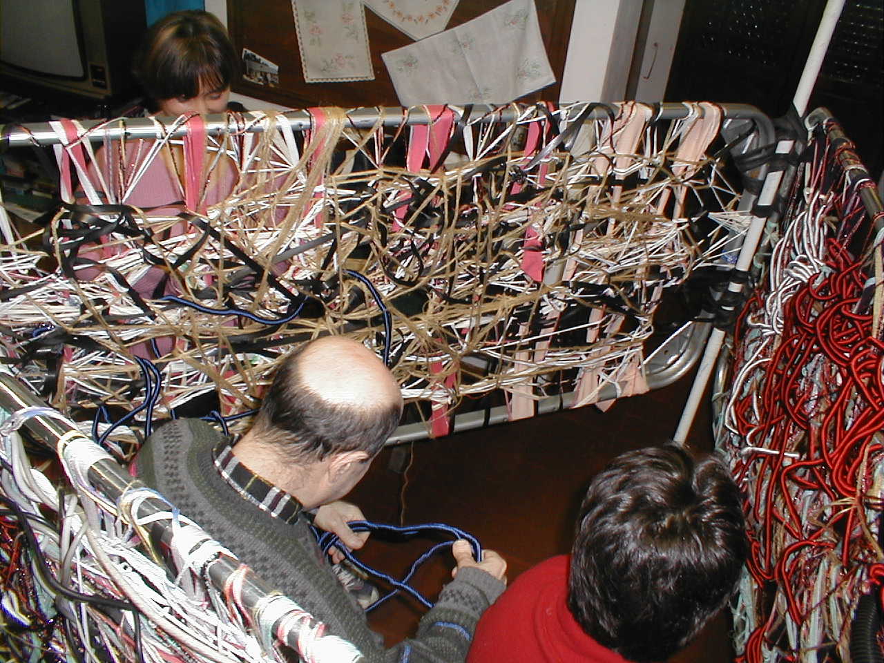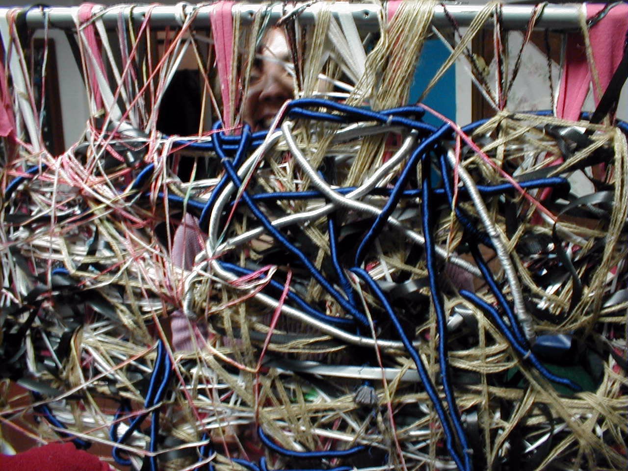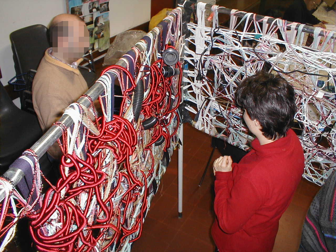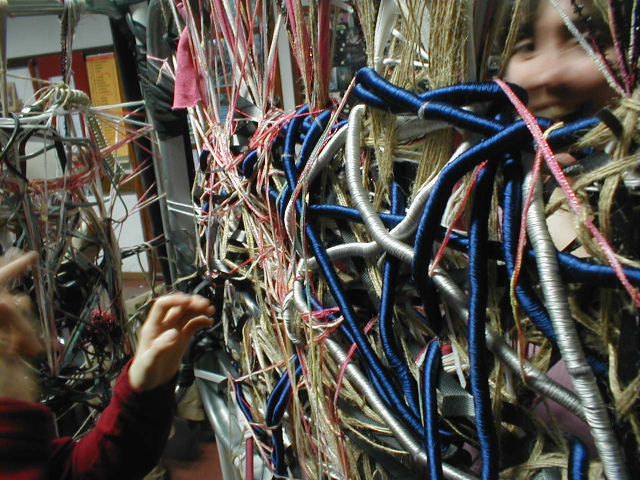 Per costruire un pannello della Casa, propongo agli Utenti di riempire il telaio del letto con delle fibre: è come impagliare una sedia ma con grande libertà di improvvisare intrecci, materici e cromatici. Intessiamo tanti fili disparati: di lana, di cotone... anche fili elettrici. Intessiamo anche cordami, nastri di seta, reggette da pacchi, tubi flessibili per impianti elettrici, gomme da bici... qualsiasi fibra e qualsiasi materiale appena vagamente tessibile e, normalmente, sempre di recupero. Irretiamo pure vari oggetti e/o feticci, come mosche catturate dal Ragno... in effetti, questa tela è Casa sua.