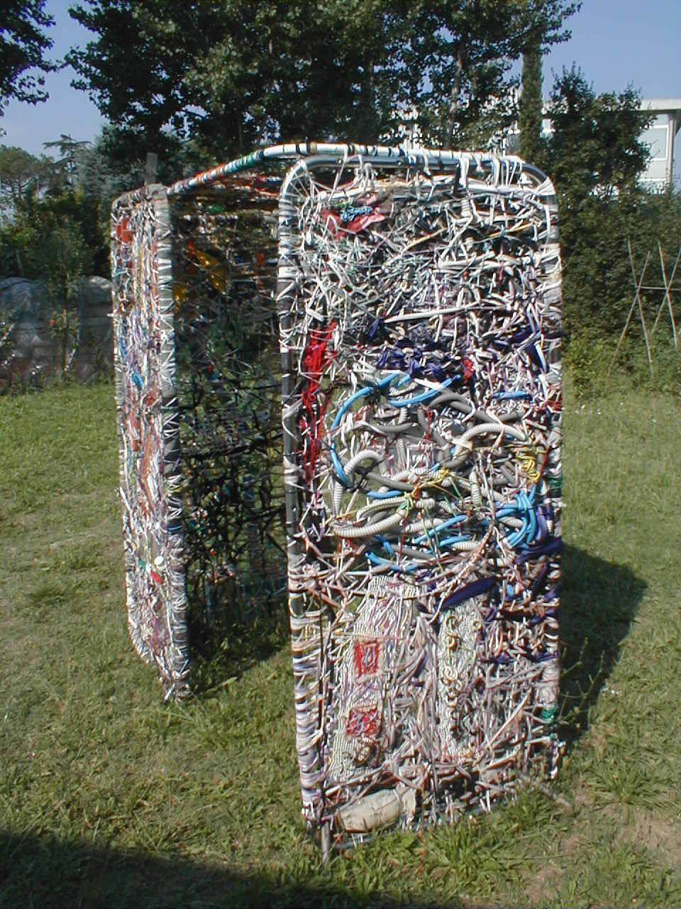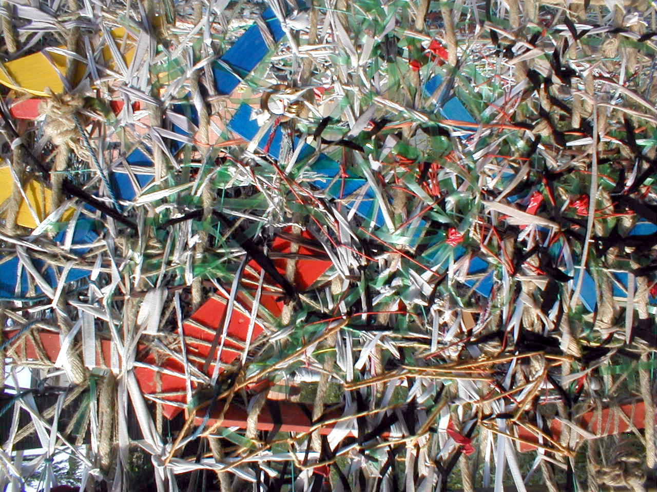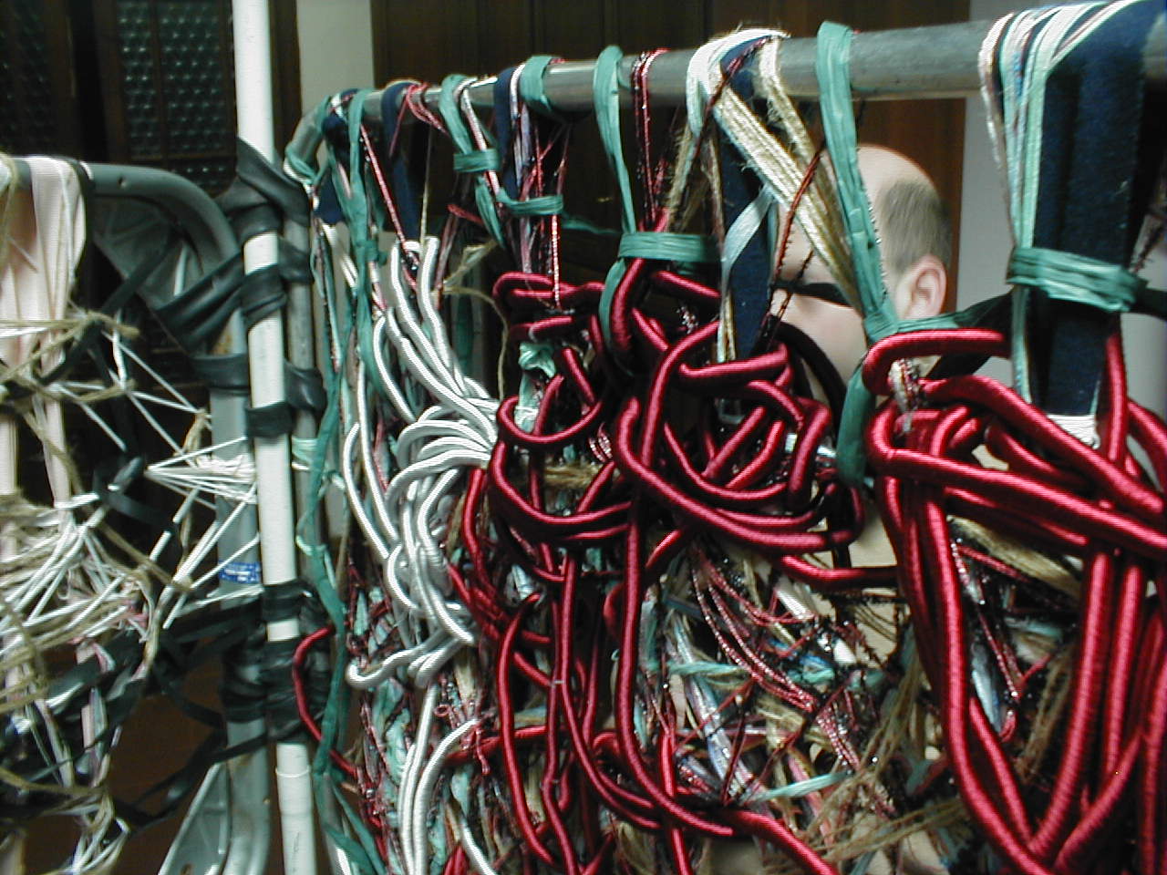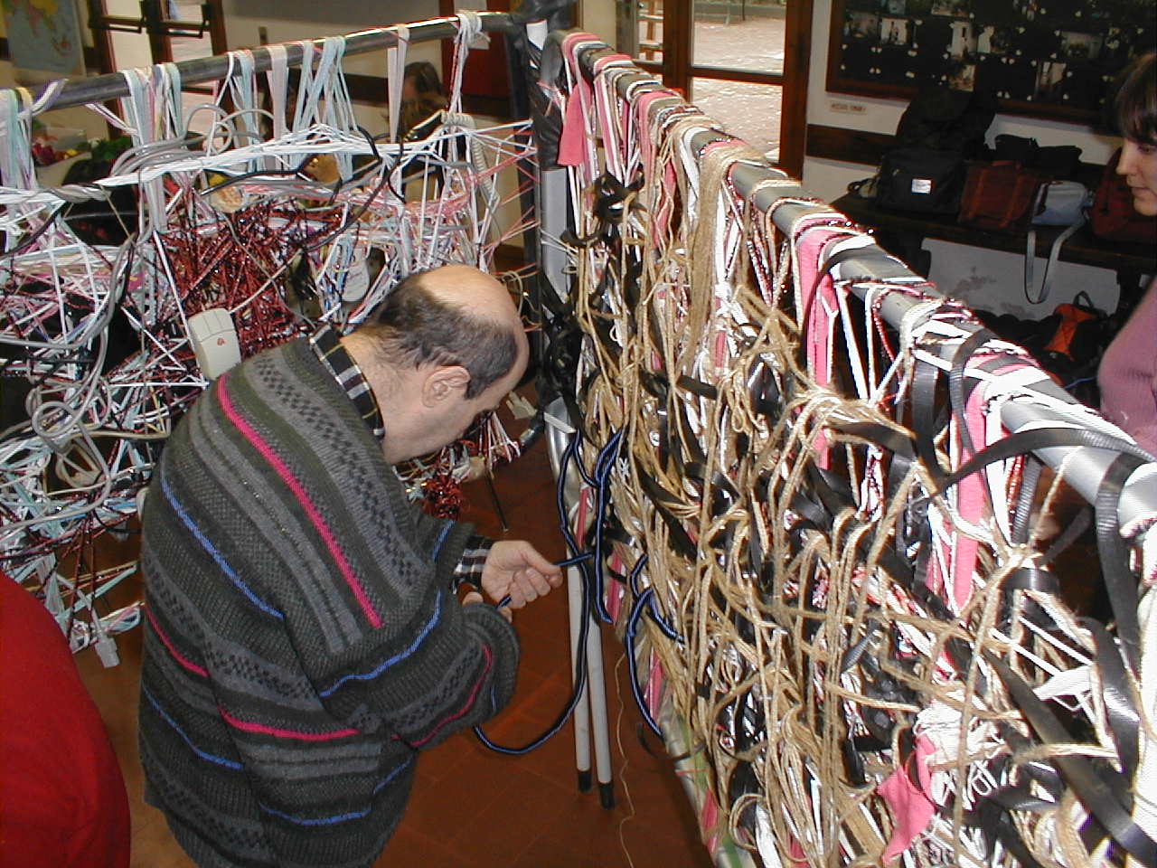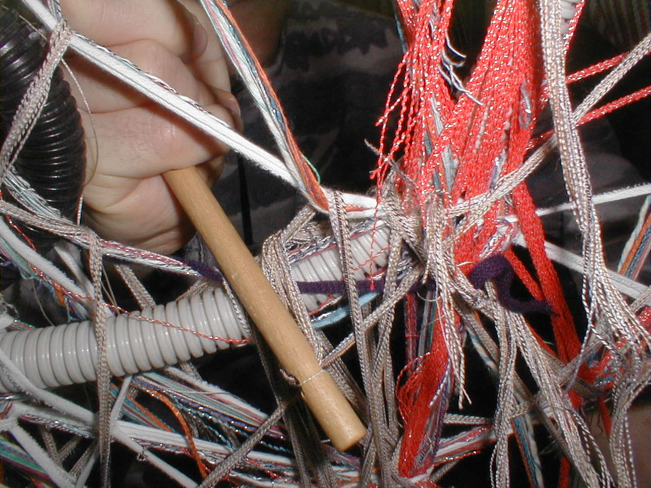 Per costruire un pannello della Casa, propongo agli Utenti di riempire il telaio del letto con delle fibre: è come impagliare una sedia ma con grande libertà di improvvisare intrecci, materici e cromatici. Intessiamo tanti fili disparati: di lana, di cotone... anche fili elettrici. Intessiamo anche cordami, nastri di seta, reggette da pacchi, tubi flessibili per impianti elettrici, gomme da bici... qualsiasi fibra e qualsiasi materiale appena vagamente tessibile e, normalmente, sempre di recupero. Irretiamo pure vari oggetti e/o feticci, come mosche catturate dal Ragno... in effetti, questa tela è Casa sua.