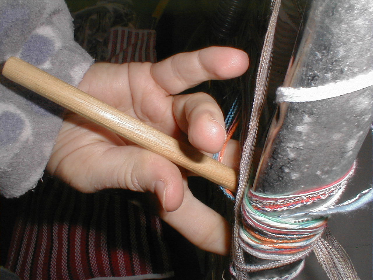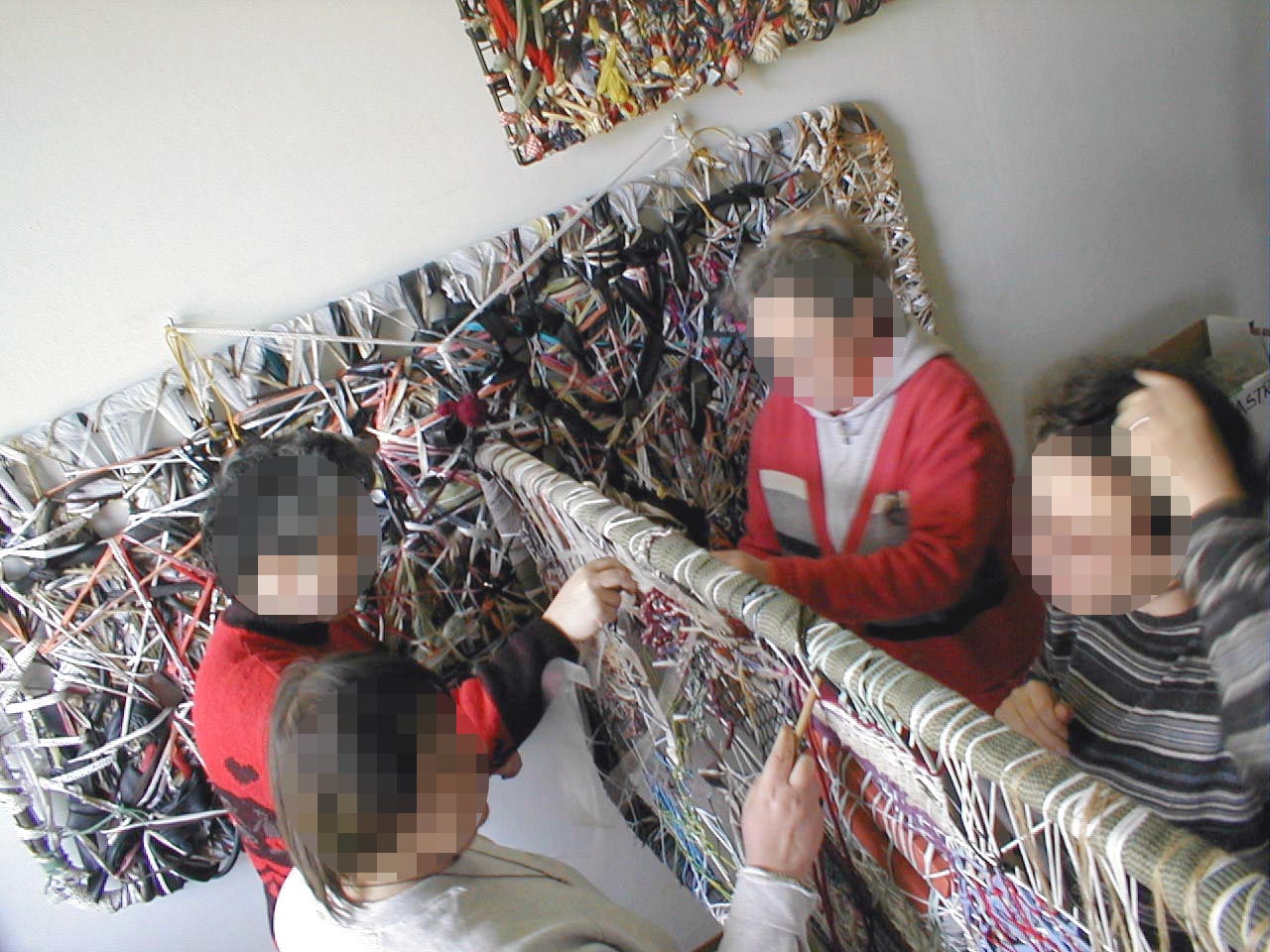 Per intessere il pannello, dispongo la cornice del letto di taglio fra una o due coppie di Utenti, o anche tra coppie formate da un Utente e un Operatore. Con divertita complicità, le coppie in azione si passano il filo a vicenda, attraverso il diaframma del telaio, che va sempre più addensandosi, fintanto che il pannello si consideri finito.