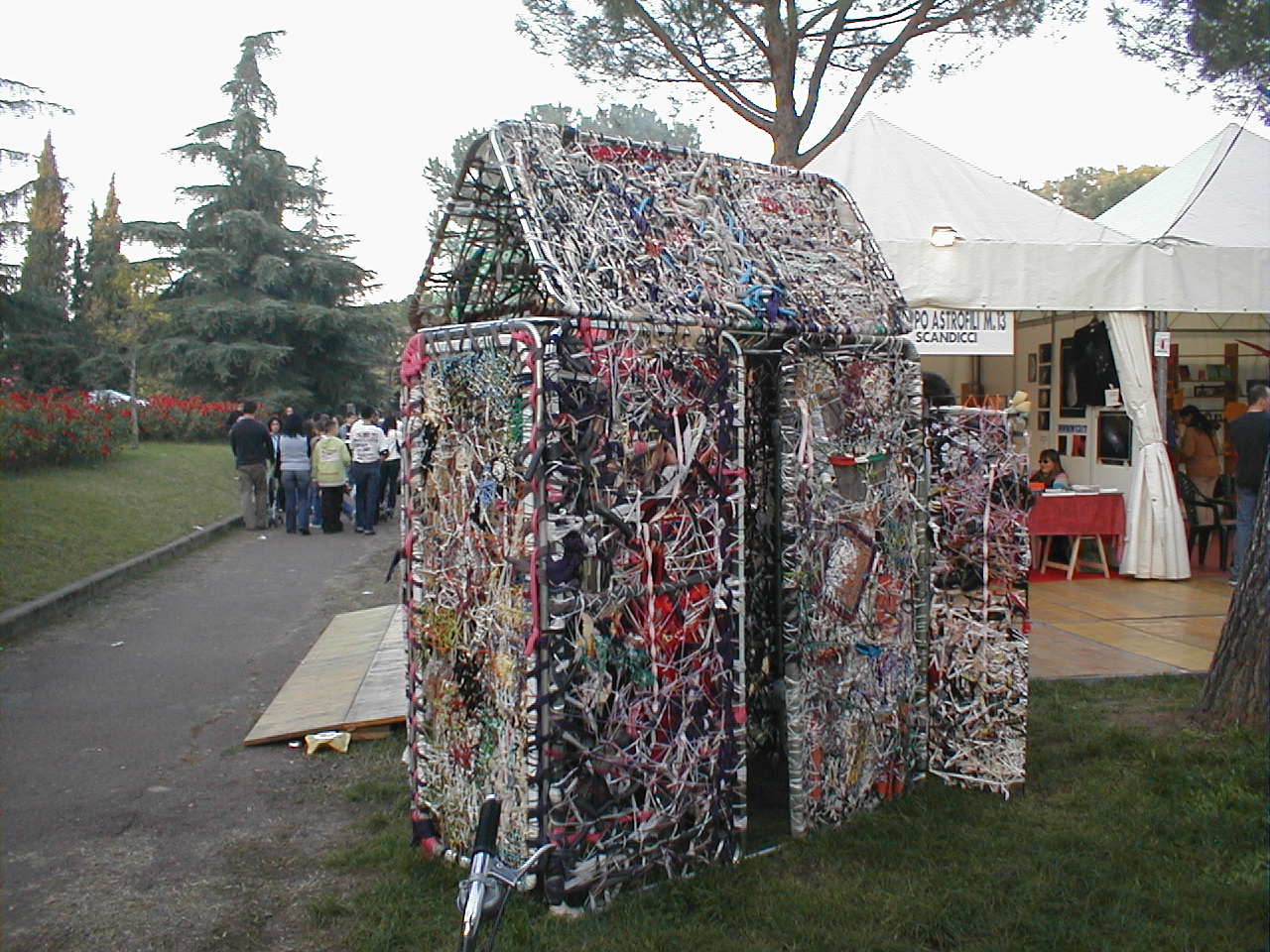 La Casa è composta da pannelli della stessa dimensione (modulari), che intessiamo separatamente entro delle cornici di recupero, reperibili molto facilmente. Sono di telai di letto, rottamati, dai quali ho estratto la rete metallica per utilizzarne solo la cornice. Per montare insieme la Casa, si congiungono i pannelli per mezzo di comuni fascette di plastica, che stringono insieme i tubi di cornice, e si ancora al suolo la base con dei picchetti. Ciò si fece agevolmente in occasione di feste nei Centri e di esposizioni pubbliche, non connotate per disabilità. Con quanti più pannelli disponibili, la Casa si ingrandiva tanto più. Il pubblico ci entrava e ne usciva, alquanto interessato e divertito, spesso convinto di aver visitato un'opera d'arte contemporanea. In effetti, e di norma, si espone assai di peggio, assai meno divertente e interessante (9).