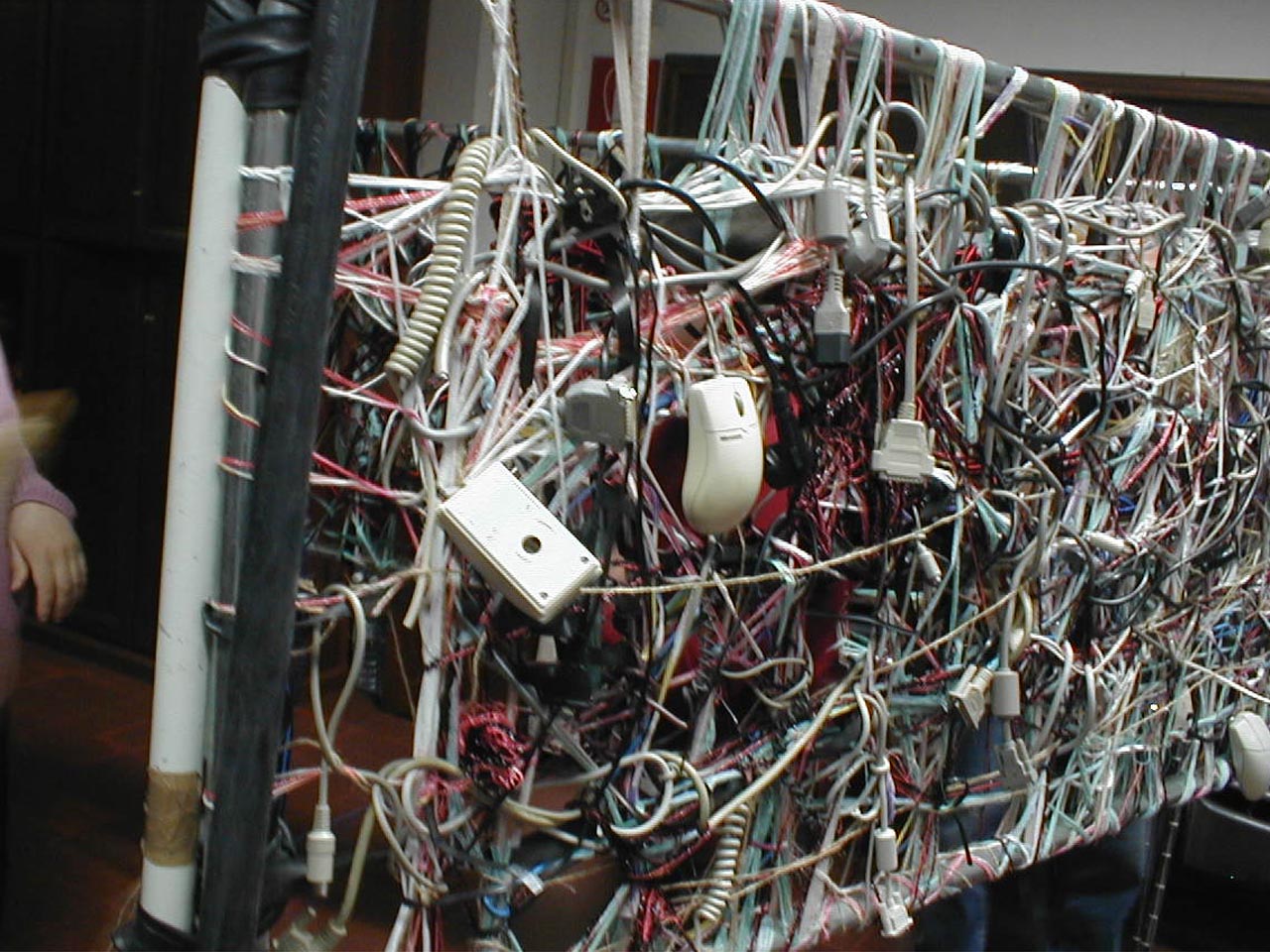 Pannello con inserziontessile di componenti dei vecchi computer rottamati dal Centro (mouse e cavi).ORrif_5.JPG