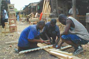 Sections of the Exhibition The music and dances of the loom In the cultural fabric of the Ewe the loom is intimately linked to music and dance. These three arts are traditionally learnt and practised by everyone. And so, Hand-in-hand Weaving opens with a Textile Performance by the weavers of the village of Klikor, along with their families and children. They bring along their best cloths and instruments, both textile and musical. To the accompaniment of a sacred weaving song, they weave and dance before their traditional kings, before the diplomatic representatives and a delegation from the Italian government. Meanwhile, in the village of Klikor, a child is born, who will be called Exhibition in memory of the event. >>> Performance >>> People Classics The exhibition opens with a number of precious "nyonuvo" and "nutsuvo", traditional female and male cloths. These masterpieces of textile art are on special loan from private collections and royal wardrobes. They are items to be used rather than contemplated, frequently in need of considerable restoration. But museum conservation is not yet the main concern here... >>> Classics Beyond the market: the home There are still many skilled weavers in the Ewe villages. The trouble is that, in the majority of cases, they are forced to work on second-rate articles because they don't have the money to pay down for good quality yarns with the right dyes. And so their expertise is devoted to the weaving of ephemeral articles: souvenir fabrics for some important ceremony...but the colours of which will run with the first drop of rain! This is the cloth normally demanded by the Market; it is called "Asivo": market cloth. But if "Asivo" is the rule, there also exists the exception: "Afevo", which means "home cloth", this is precious fabric, designed to wear and worthy to be included among the family heirlooms. A family's respectability is linked to its economic and cultural possessions: genealogy, lore, glass beads and fabrics. Afevo is also the name of a collection of cloth samples which the weavers of Klikor donate to their village museum: the Bakhud Museum. Finally "Afevo" is also the name of a website and CD-Rom where each sample, multiplied on the computer screen, becomes a stage on a kaleidoscopic journey through a hundred original chromatic modules. This is the most extensive document on Kente available on the Internet. There is also an annotated catalogue of the pieces, featuring images and texts illustrating all the phases of the weaving within its environmental and cultural context. >>> AFEVO Home Page >>> BLAKHUD Home Page Woven Encyclopaedia "Klikor Icon" is a "woven encyclopaedia" created in 2001 by 15 Klikor weavers who set to work on a single loom to weave their designs (icons) using the "Adanu" (brocade) technique. They have thus created a cloth 55 metres long, featuring hundreds of traditional and modern icons of Ewe weaving. Each icon is also a symbol, because it comprises multiple meanings: maxims, sayings, proverbs. All the Klikor icons have been interpreted and explained by Dale Massiasta, the Director of Blakhud. >>> KLIKOR ICON Home Page New proposals In order to develop a market abroad, the art of African weaving cannot be restricted to the offer of nyonuvo and nutsuvo the classic male and female cloths. The form of these traditional articles is difficult to adapt to new functions. Instead, an immediate example of a new format is Bedspread B1, designed by adapting the compositional symbols and structures of the traditional cloth to the normal dimensions of a bedspread for a double bed. Hemp Hemp is an ecological fibre of excellent qualities. The weaving of precious articles in hemp yarn is a perfect way to reach new markets. The exhibition displays two experiments: >>> HempStrag is a bag made using the traditional model of the single strip (abadakà). The woven strip is folded in line with its sub-sections (atijija) and is then sewn together with three straight seams. >>> Icon Table-mats for the dining-table. Each item is brocaded with a different icon, always designed in the traditional form of the strip. Woven writings The "legend scarf" is possibly the most successful gadget ever created using Kente cloth. These are normally decorated with legends such as "Greetings from Ghana" or the names of colleges or companies and various commemorative phrases. These cheap scarves are made of Asivo: low-quality market fabrics. But they can be valorised. >>> Pearls of Wisdom in Klikor is a "woven anthology" of the numerous mottoes and sayings which decorate walls and vehicles in the village of Klikor (in Ghana, you are greeted by a proverb at every corner). As well as the concepts of the individual messages, precious here are both the lettering and the composition of the plain-weave ground, referring back to the Afevo tradition. B1, HempStrag,Icon Table-mat: Luciano Ghersi & Mensah Kpodoh. Pearls of Wisdom: Eva Basile & Robert Aleawobu Events and Initiatives Documentary panels on: the exhibition and workshop at the Artemision Fiber Art Festival (Görlitz) with the participation of the weaver Mensah Kpodoh; course at the Fondazione Arte della Seta Lisio; performance and workshop at Ex Tempore, International Fine Arts Academies Symposium etc. >>> Events Texts Hand-in hand weaving in a story by Virginia Ryan: >>> Spinning Yarns the essays and articles published in Textile Forum, Jacquard, tessereAmano, www.hypertextile.net . >>> Texts Finally... A few Italian experiments in Kente weaving. Luciano Ghersi: Magnetic Kente. Weaving of waste materials with inserts in magnetic rubber, can be draped at will on metal panels. Eva Basile: My Kpevi. Three-dimensional variations on the double warp or Kpevi, a traditional technique of Ewe weaving . Tessere Liberi, Self-run African Weaving Workshop: Sample Banner made of fragments of cloth woven by the pupils. Continues... Thanks to this exhibition too, hand-in-hand weaving continues, with new hands and with