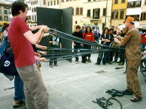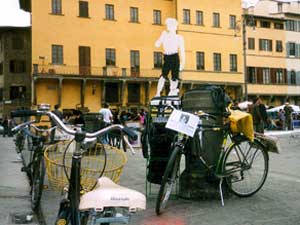 > Archivi >Secondo e Terzo Cantiere Firenze, 23 e 25 aprile 2004 Il 2° e il 3° il terzo telo per le Brache sono stati agevolmente tessuti in altre due piazze fiorentine. Il 2° Cantiere si è tenuto il 23 aprile in Piazza Santa Croce, di fronte agli storici sepolcri dei massimi artisti d'Italia (arti pubbliche a parte, i cui artefici saranno sempre ignoti). Il 3° Cantiere si è tenuto in Piazza Salvi Cristiani, zona Forza Nuova (per ora) in occasione della "Festa Antifascista (25 Aprile), con l'affissione del bando: Il FASCIO lega insieme rigidamente tanti bastoni al servizio di una scure. La TESSITURA collega flessibilmente tanti fili diversi in una rete comune. Puoi tessere a mano, anche tu un bel paio di brache da ciclista per il David (la celebre statua di Michelangelo) Puoi divertirti insieme con gli altri. Puoi ri-biciclare un famoso monumento. Puoi passare alla storia dell'arte. Puoi imparare a fabbricare qualche cosa recuperando i cosiddetti rifiuti. Se vuoi sapere che cosa significa questo paio di Brache, sappi che oggi, nel traffico urbano, il piccolo ciclista è come il David: ha da sconfiggere un gigante Golia, che è l'automobilismo prepotente e inquinante, paranoico e consumista. Se vuoi sapere come funziona, non hai che da provare, è molto sempice: bastra mettersi inseme per intrecciare gomme forate di bicicletta. Brache al David! Bici al popolo! NO al Fascismo e simili! verso il 4° Cantiere: Piazza Signoria |