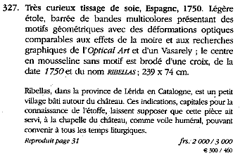 E già tanto che un tessuto realizzato con un vile telaio a 4 licci sia proposto in un'asta che comprende tessuti operati antichi, seterie, scialli Cachemire e tessuti stampati su disegno di Andy Warhol o di Sonia Delaunay!