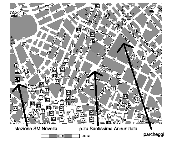 Piazza Santissima Annunziata si raggiunge facilmente dalla stazione di SM Novella: in autobus (linee 6, 31 e 32) o anche a piedi, camminando per circa 20 minuti. Arrivando in auto si può trovare parcheggio lungo i viali di circonvallazione, attorno alla zona segnata sulla cartina. Chi desidera fermarsi a a Firenze per un paio di giorni tenga
