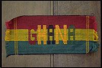 per i suoi tessitori di stoffa Kente. Il Kente è tessuto con fili di vari colori. Per tessere questa striscia, il tessitore ha usato fili verdi, gialli e neri. |