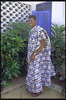 Kwame, il fratello maggiore di Kweku, è un ottimo tessitore! Sta indossando una tunica di stoffa Kente che lui stesso ha tessuto e confezionato. E' fatta con 19 strisce! Lo fa sembrare un re! |