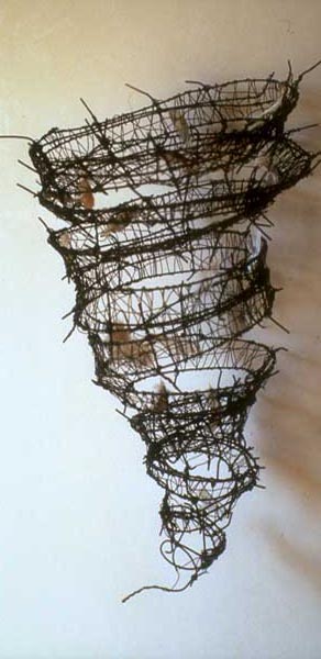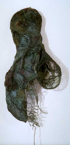 (D). Primo Premio: Lucia Pagliuca (Roma) con "Prorompe il grido". Lavoro informale con tecniche varie, nel quale si scoprono allusioni al Burqa delle Afgane. Secondo Premio: "Batavia" di Alessandra Ruo (Vieste), inserzioni di ossi di seppia in ordito di lino rimesso batavia, confezione tridimensionale. Terzo Premio: "Tornido" di Giuseppe Scala (Siracusa), scultura in fil di ferro e piume. Premio speciale per residenti friulani a "Pelle 01" di Barbara Girardi (UD), abito "investibile" tessuto con lane, cocco e fil diferro. |