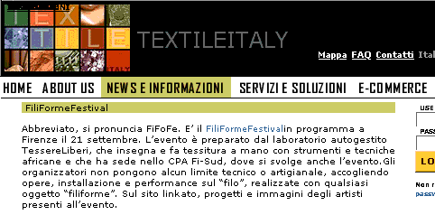 la parola e la critica a: Giulia Nochers ~ Eva Basile ~ Franco Piri Focardi 1000 GRAZIE al CPA Fi-Sud. Oltre a ospitare, nutrire, supportare e sopportare FiFoFe, ha largito un contibuto di 100 Euro, divisi tra gli artisti che hanno dovuto affrontare più spese. 1000 GRAZIE a tutti quanti hanno collaborato gratuitamente con arte, manovalanza e informazione al FiFoFe: Tra questi ultimi, in particolare: TESSIMILIA ~ exhibitart.com ~ linificio.it ~ undo.net ~ tessereAmano ~ textileitaly.com ![]() |