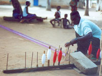 | Warping The thread is dried afters soaking in a kassava sarch solution. It is then spun in AYITI (warp spool) and ready for warping. William Azameti spinning by ETIEOMO, Unknown weavers planting NOTSIME pegs. Mensah Kpodoh controlling LOHO. Klikor; 2001. |