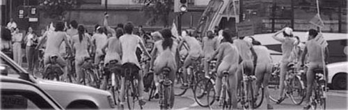 PER ITALIA: http://italy.indymedia.org/news/2004/04/526633.php Giustizia nelle strade, è questo quello che seriamente chiediamo, con ferma convinzione, però anche con allegria, spassandocela un po'. Le macchine ci impongono la loro legge: velocità, prepotenza, "cattivi fumi", e violenza. Per questo, spostarsi tutti i giorni in bicicletta per la città, converte il nostro movimento in un atto di disobbedienza quotidiano. Se inoltre manifestiamo in bicicletta e nudi, convertiamo la disobbedienza in una protesta esemplare. IL Coordinamento del Collettivo