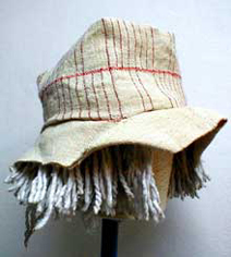 After the no-cut featuring of "Strag" and "Strat", the cloth is cut again in the "Daccapo" hat, but only following the weft thread that's quite unusual in hat featuring. Third item of the Afro<>loom Weaving Lab. Warp & weft: hemp see it also in Web-CID