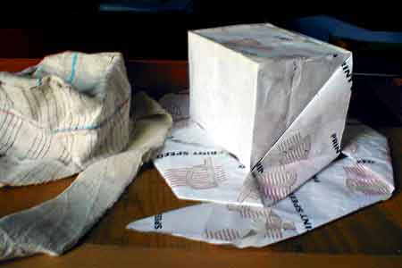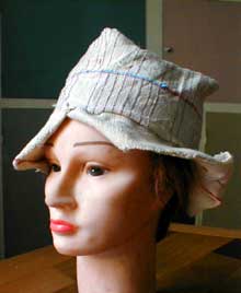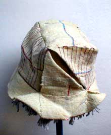 The "Strat" (strip=hat) is featured with one strip, without any cut in the cloth After "Strag" (strip=bag), "Strat" is the second item of the Afro<>loom Weaving Lab. warp & weft: hemp ![]() Hemp on the head: 1 | 2 | 3| >>> next...