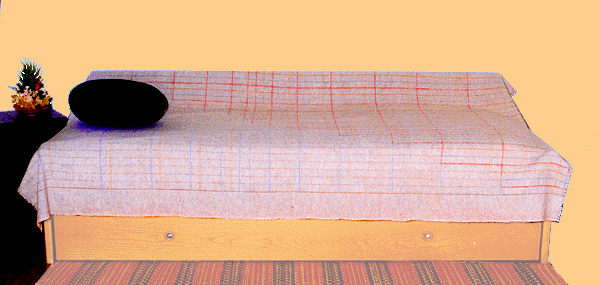 ![]() sul letto: zafu e Telo a ordito deviante (1983) altro Telo in Residenze 3 |