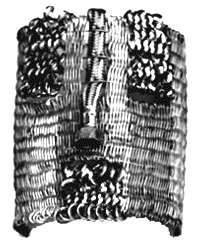 Il tessitore tesse a mano i suoi fili: fili dì ferro (cotto o zincato), fili di rame. Poi tesse dei bei chiodi, dei tubi da doccia e altra ferramenta, chiaramente, di recupero. Poi quando il tessuto di ferro è uscito fuori dal telaio, quello stesso tessitore lo prende a martellate. Ecco Iì che è diventato uno scultore. Infatti, dà la forma di un volto al suo tessuto, tessuto che sta per diventare una... MASCHERA TESSILE DELL'ETA' DEL FERRO.