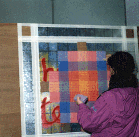 Il pubblico dispone le tessere magnetiche e ricostruisce come un puzzle la speciale tela di Madras. Lo aiutano il modello visivo del tessuto originario (che è steso lì di fianco alla lavagna) e il modello logico-mistico delle sue simmetrie (alto = basso = destra = sinistra).