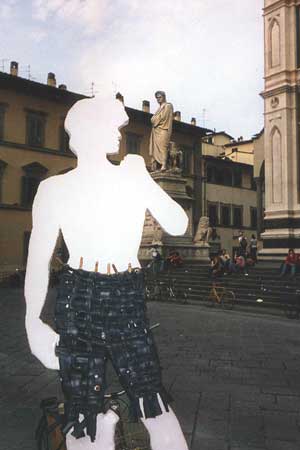 > Archivi >verso Piazza Signoria Firenze, 5 maggio 2004 L'esperienza maturata nei Cantieri già svolti con pieno sucesso, consente di snellire l'impianto del prossimo cantiere, che è pervisto in Piazza Signoria, angolo Uffizi, in prossimità della celebre copia marmorea del David. L'intera attrezzatura si può ora trasportare anche con un singolo carico ciclistico. La stessa bicicletta impiegata per il carico, una volta parcheggiata, funge da piedistallo per il David-modello, senza occupare perciò indebitamente alcun suolo. Il David-modello su bici può anche circolare (in tondo), attorno all'impianto del cantiere. L'azione di montare il telaio, insieme con quella successiva di tessere, si effettueranno in pochissimi minuti. A differenza dei cantieri precedenti, Il telaio per tessere non sarà più ancorato a un punto fisso (parcacarro, albero, colonna) ma sarà mantenuto in tensione da un gruppetto di persone, disponibili all'umile ruolo di "àncora umana". Umile ruolo ma indispensabile: "Dato un punto di attacco, si può tessere il mondo". Sicché tutto il Cantiere assumerà un impianto assolutamente, e opportunamente, mobile. Oltre all' "àncora umana", all'altra estemità del telaio, si schiera il gruppo che divarica le gomme dell'orditon alzando e abbassando le braccia. Nel mezzo del telaio, rimangono coloro che inseriscono la gomma della trama e l'accostano al tessuto con il pettine di ferraglia. Giova sempre ribadire che la effettiva vestizione del David con le Brache finite è riservata a un cantiere successivo: il Cantiere Definitivo. Prima di questo infatti, resta ancora da tessere l'ultimo telo. Poi resta da assemblare le Brache, cucendo con il filo più sottile: la gomma per bici da corsa. |