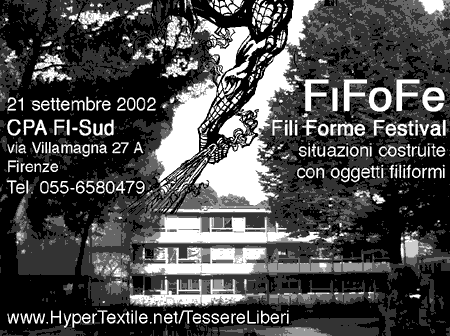 CPA FI-Sud www.ecn.org/cpa via Villamagna 27/A, Firenze 21 settembre 2002 ore 19-24 FiFoFe Fili Forme Festival installazioni e performance sul FILO con qualsiasi oggetto FILIFORME senza alcun limite di materiali "il filo collega tutti gli stati dell'esistenza, tra di loro e al loro principio." R. Guènon