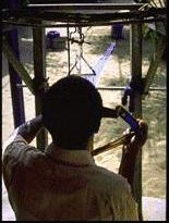 fili dell'ordito si distendono lontano lontano, mentre il tessitore siede al telaio. Il telaio è di legno e tiene tutti i fili tesi e ordinati. Il telaio è lo strumento più importante per il tessitore e lui chiede ogni giorno ispirazione al Dio del telaio, perché lo aiuti a tessere una buona stoffa Kente. |