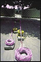 All'altro capo, gli orditi se ne stanno arrotolati in ordinate spire di fili, appoggiate a pesanti pietroni. Il tessitore trascina i pietroni verso di sé, via via che va tessendo. |