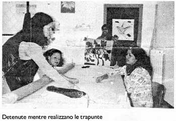 Tra breve, avremo anche un servizio sul laboratorio di trapunte e arazzi che Patrizia Melandri sta facendo nel carcere di Livorno. Ci sono altre realtà nel "tessuto carcerario" ma nessuno, fino adesso, ce le ha voluto raccontare. Se gli "operatori" non hanno tempo o voglia di farlo, potrebbero facilmente incaricare di questo i loro "operati". Si sa che i detenuti hanno tempo e voglia di scrivere... c'è qualcuno, fra i tanti Operatori che ha il coraggio di mettergli in mano un foglio e una busta affrancata con l'indirizzo di Tessimilia? (Ghersi, CP 267 FI-centro, 50123 Firenze). Giro questa proposta anche a Gesualdo Marra di Brothers Keepers (vedi: www.gesualdomarraministry.com)WM Gi, 10 ottobre 2002