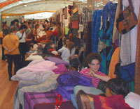![]() Leumann (TO), 29 settembre 2001 Ben 78 espositori a "Filo Lungo Filo...", settima edizione dell'annuale appuntamento dedicato alla tessitura a mano (e alle arti tessimili). ![]() Un pubblico sempre più variegato si accosta alla tessitura a mano. ![]() Il "Ragno Mediterraneo" (alias prof. Filippelli da Cosenza) "trattura" la seta dei bozzoli da lui stesso allevati. ![]() Tra i "tessìmili, un "Cappellaio Matto" al femminile: la mitica modista Carla Porri. ![]() K Chuöng, tessitrice Tai del villaggio vietnamita di Lat, con il suo telaio a tensione, per la ricchissima mostra sui tessuti del popolo Tai, allestita in Biblioteca. ![]() Meno ricca, e installata umilmente tra gli stand, la mostra "AFEVO" sui tessuti Ewe del Ghana,del Blakhud Museum di Klikor http://www.hypertextile.net/blakhud. Un telaio africano è in piena attività. Tutta la mostra "AFEVO" è però disponibile on-line su: http://www.hypertextile.net/afevo. ![]() Simonetta Battoia vince il concorso per il logo del Coordinamento Tessitori ![]() Non poteva certamente mancare Tessimilia, che presenta FotoTessere.3 |